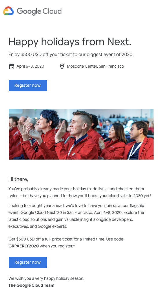 In the end, Google Cloud Next ’20: OnAir brought in 175,000+ virtual event attendees – a record-breaking registration number! Check out a few of the promotional emails I wrote and see the evolution of this campaign.